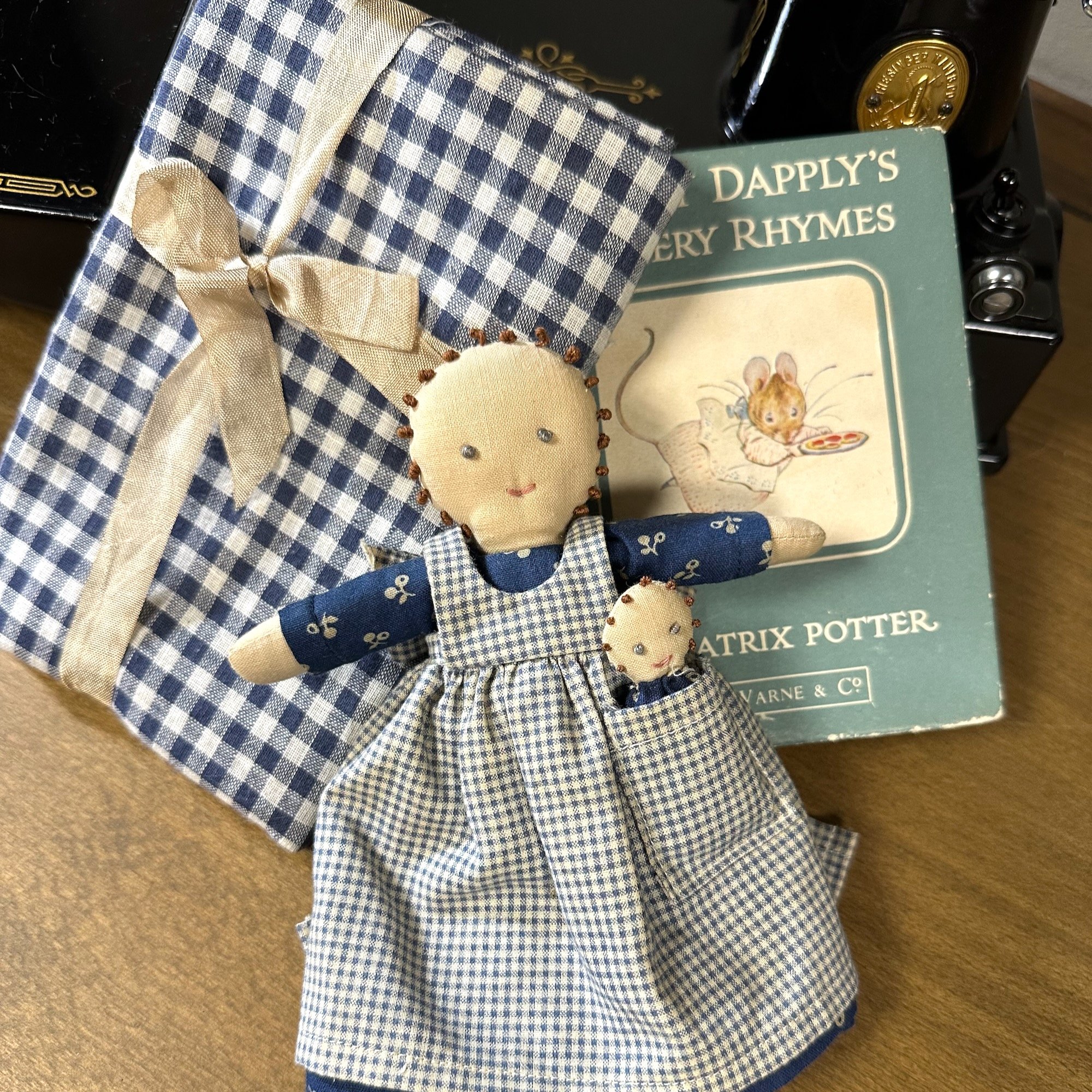 Dolly was made by my mother Eileen using a pattern from maybe the late 80's? She was a remarkable seamstress and you'll see that in the beautiful stitching. She has pantaloons, a dress and a pinafore. The tiny baby comes out of her pocket too!