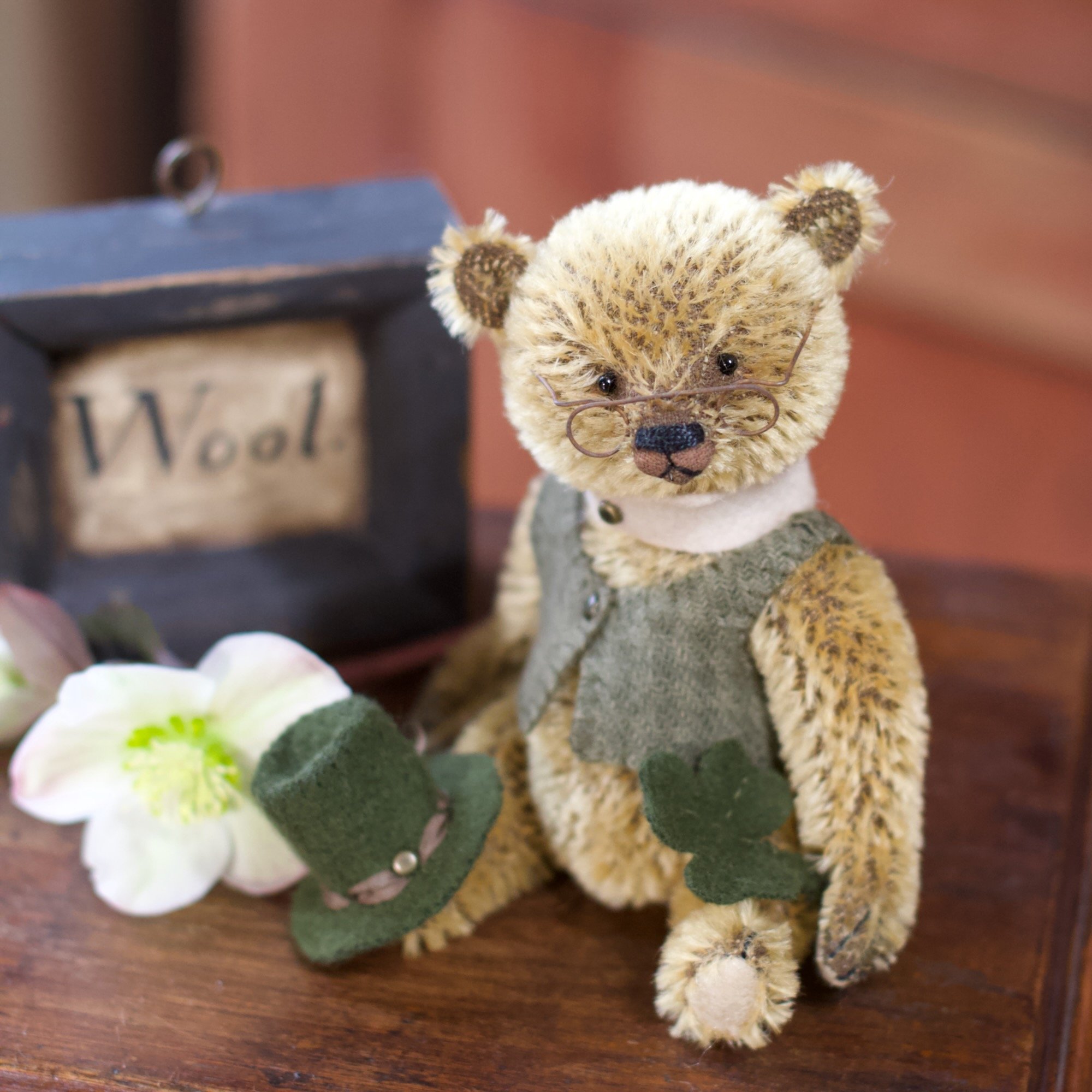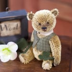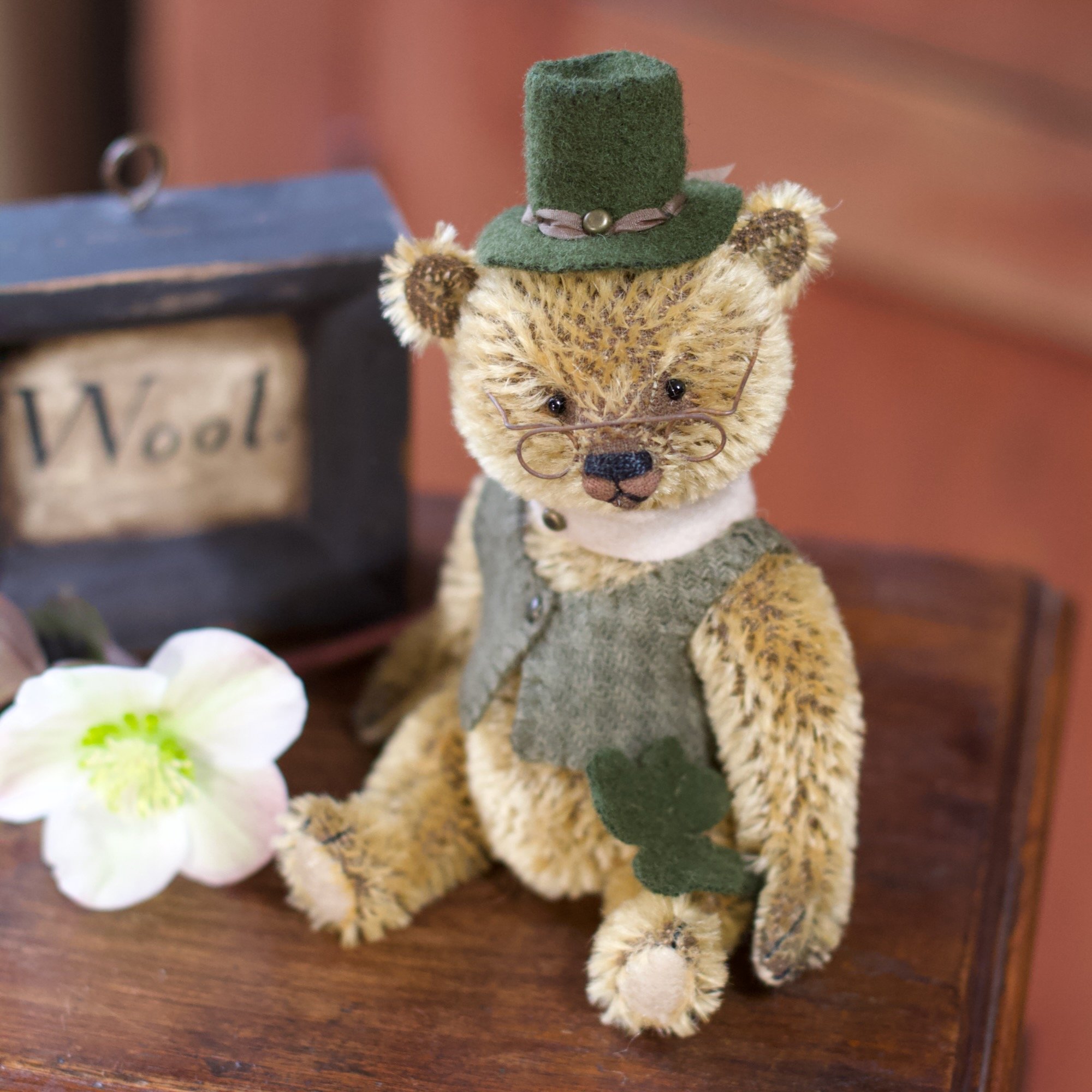Liam is created from short golden German mohair and has wool felt paws, onyx eyes and an embroidered nose. He is fully jointed and nicely weighted with steel shot to nestle into your hand. It's still chilly out, so he wears a woolen vest. A fine gentleman's collar and tiny glasses complete his look.