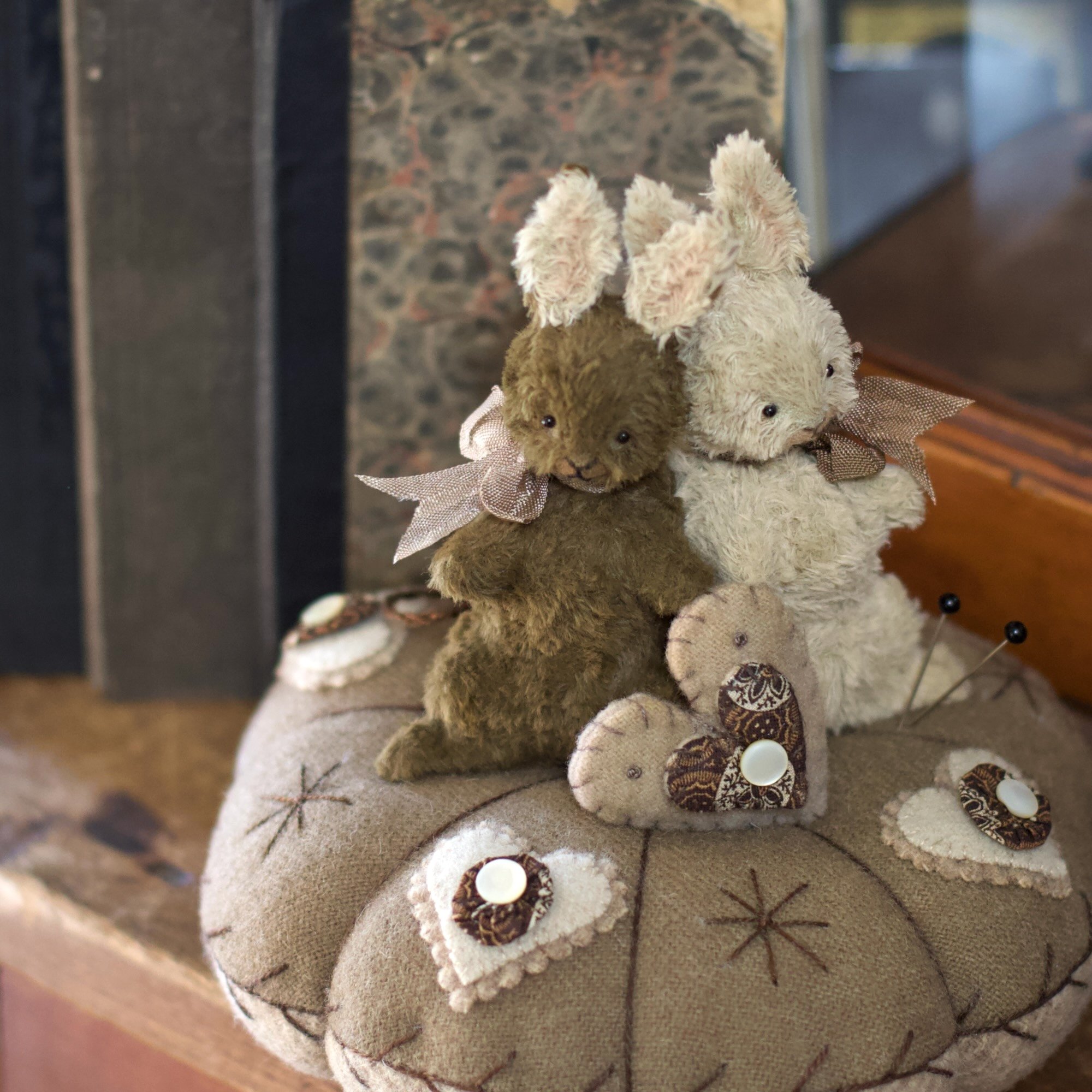 The bunnies "share one heart", that is created from wool adn antique cotton.