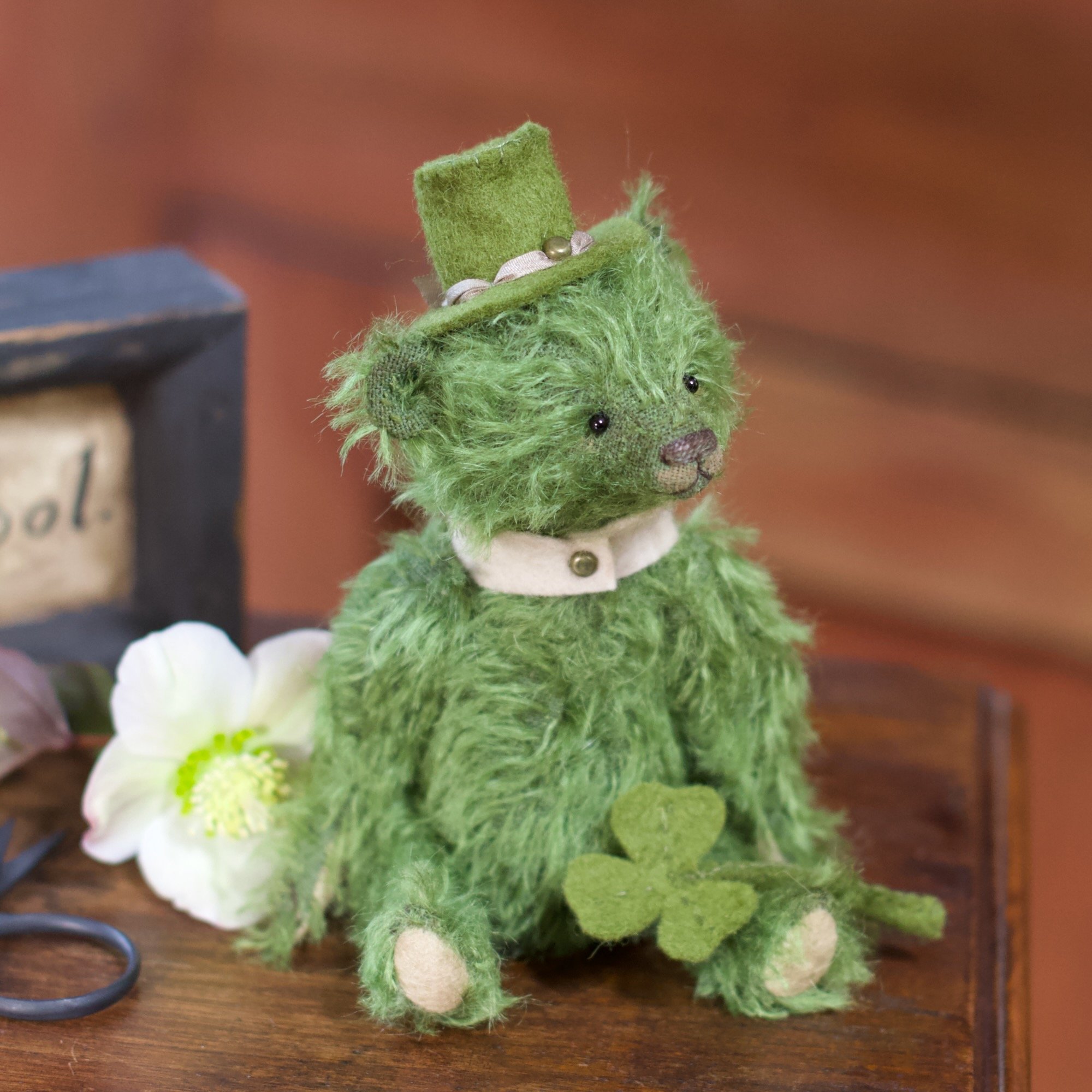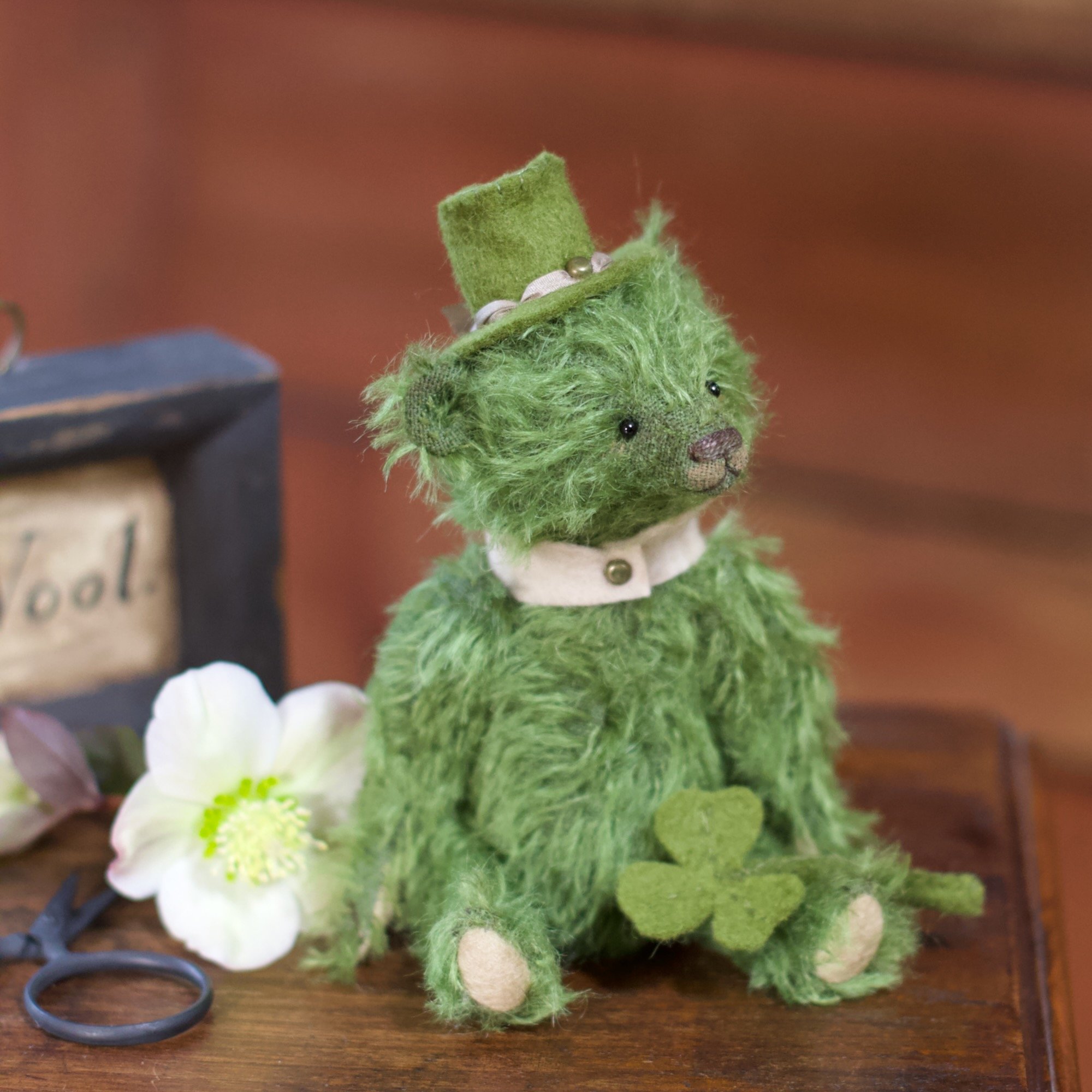 Lucky (2) is created from soft green German mohair with wool felt paws and onyx eyes.