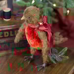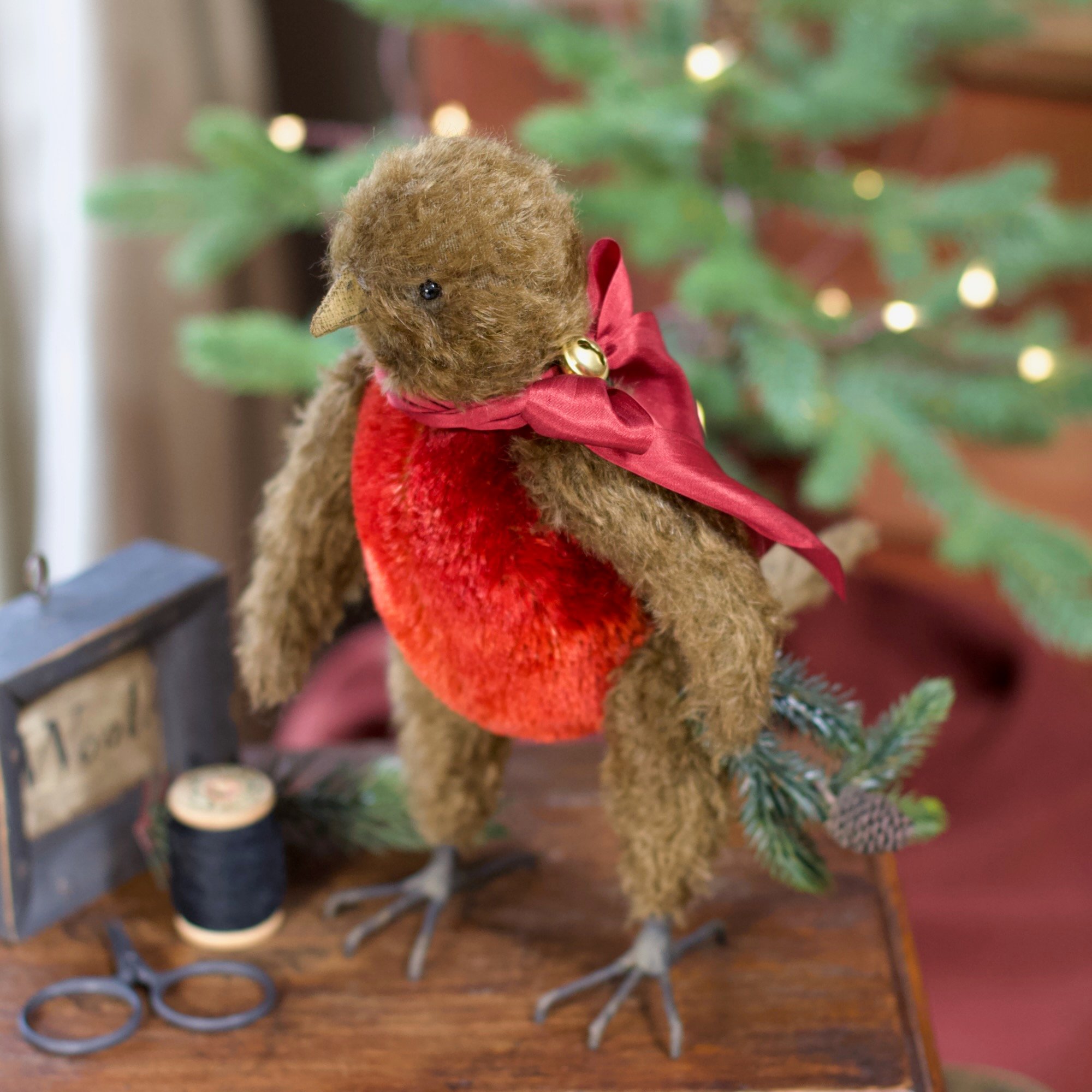 Robin is created from soft chocolate German mohair in brown and his "red breast" is antique red mohair. He is fully jointed with a wired tail.