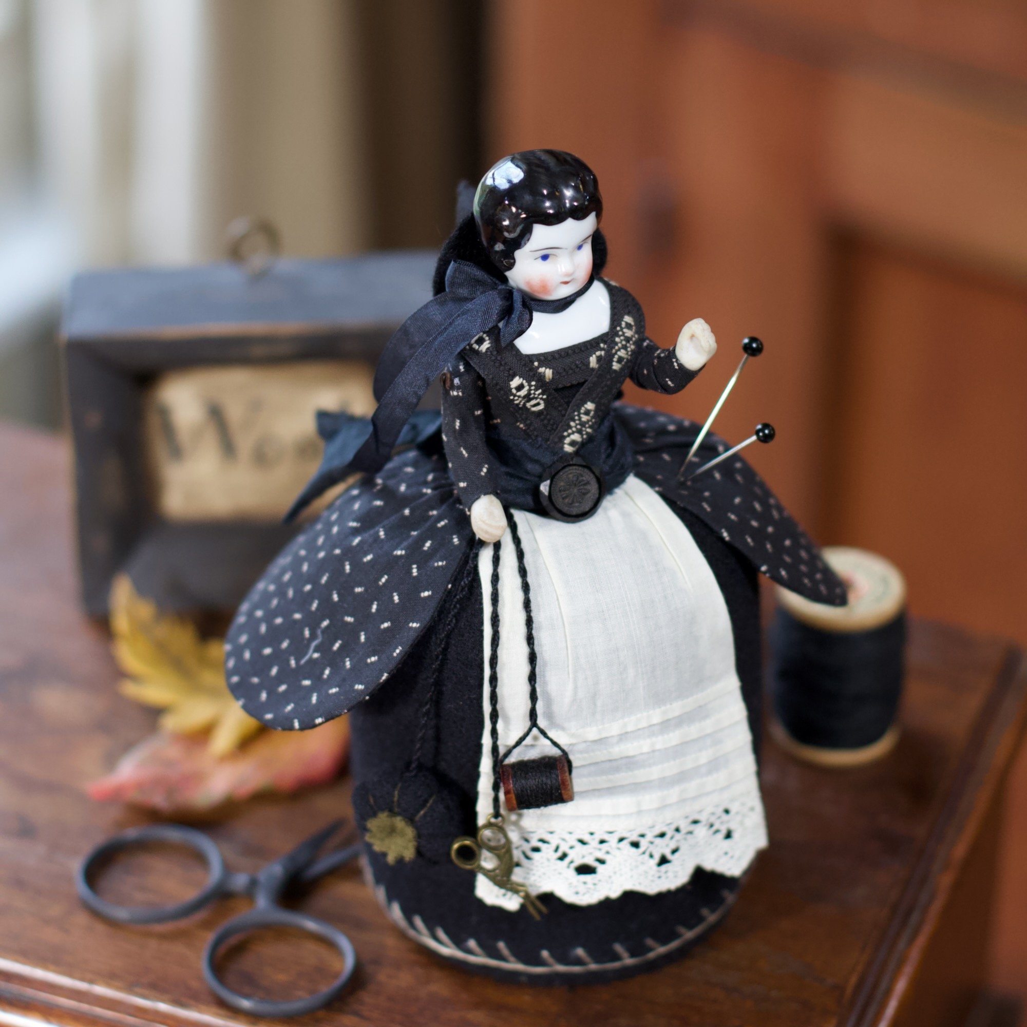 This pincushion is inspired by dolly pincushions from long ago. (especially a non-witch one in my own collection ;-)